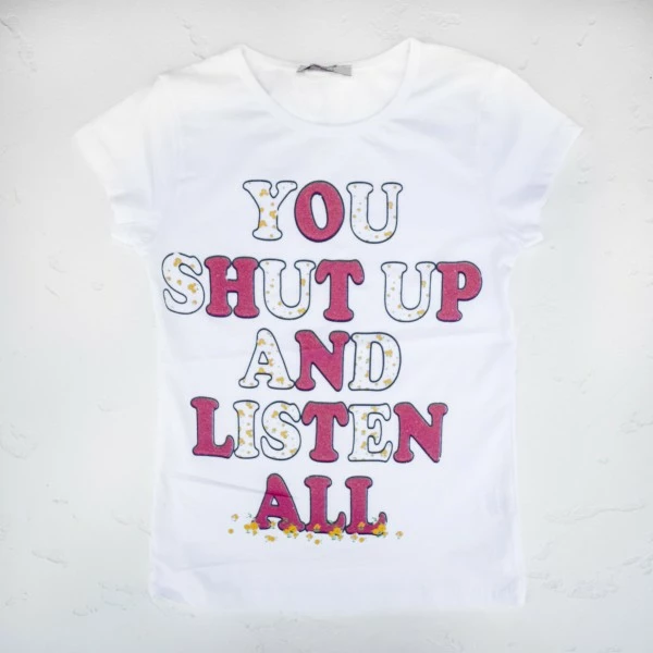 Футболка для девочки декорирована надписями. Отлично подойдет