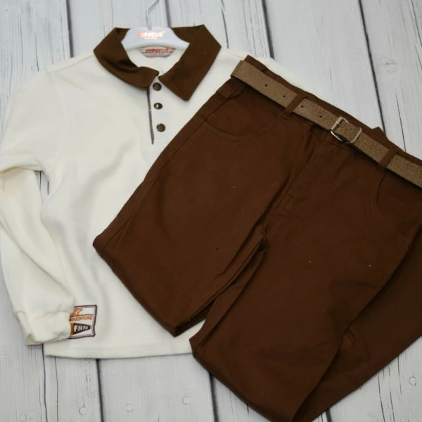 В комплект входит кофта с застежкой на пуговицах в верхней части и прямые хлопковые брюки коричневого цвета. Целостный образ из этих двух вещей создается путем включения в дизайн кофты коричневого прямого откладного воротника, окантовки бортика и коричневых элементов аппликации в нижней части изделия.