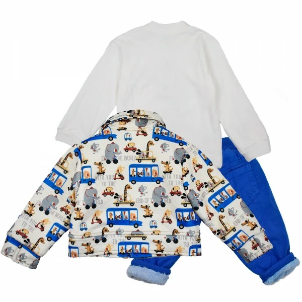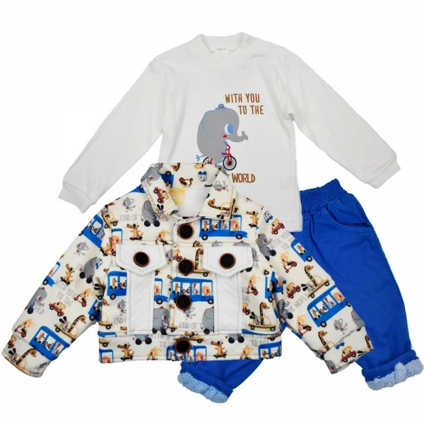 В комплект для мальчиков Ventito 3235 входит демисезонная куртка с ярким рисунком, реглан со слоником и джинсы (пояс в комплекте). Элементы вещевого набора собраны таким образом, что не имеют слишком узких частей или сложных застежек, поэтому ребёнку будет легко одеваться и комфортно носить яркий и лаконичный образ. Рукава, пояс и горловина изделий оформлены таким образом, что будут надежно защищать ребёнка от холода и ветра, но не давить на нежную детскую кожу.