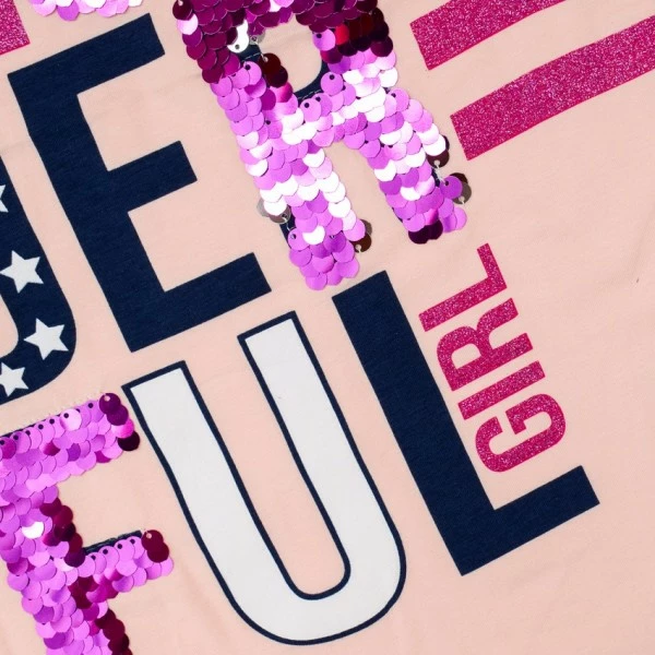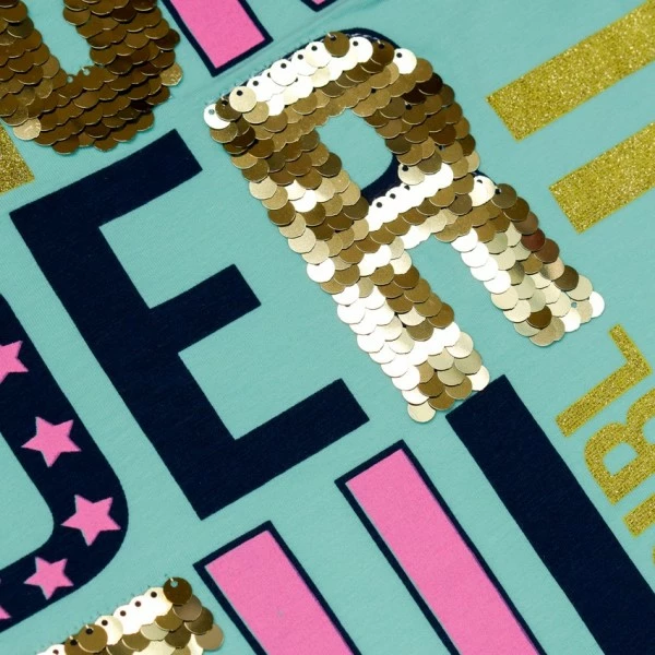 Модель украшена спереди картинкой из пайеток. С помощью такой одежды, ваша девочка сможет создать необычный, стильный образ.